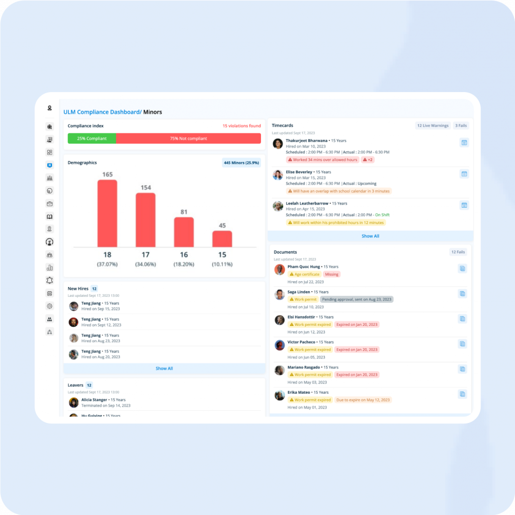 Embed minor rules, break laws and school calendars into your schedule creation automatically. Restrict publishing when violations exist and block employees from picking up shifts that violate minor labor rules.