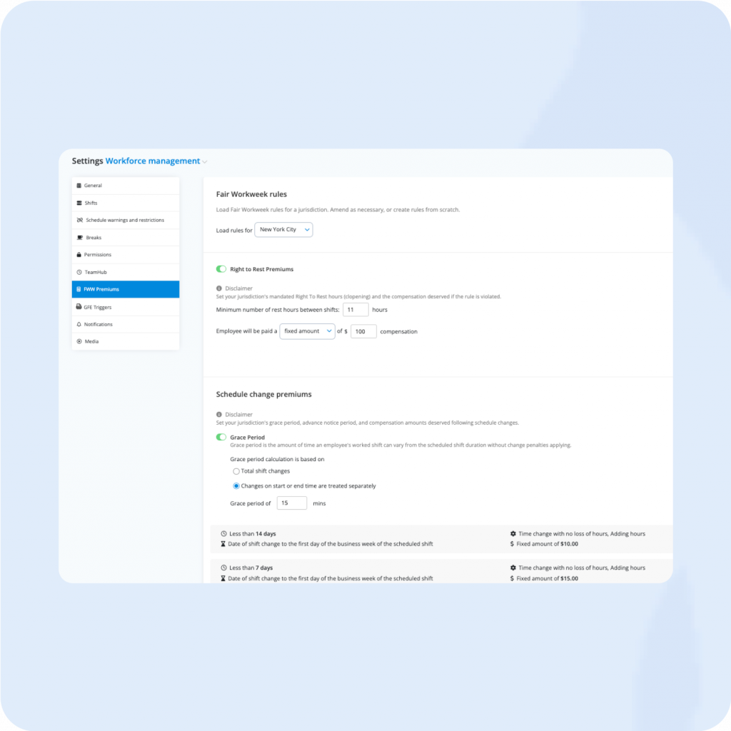Display Fair Workweek rules at the point of scheduling, and premiums will be tracked directly within the employee’s time card. Offer available shifts in compliance with the Access to Hour provision.