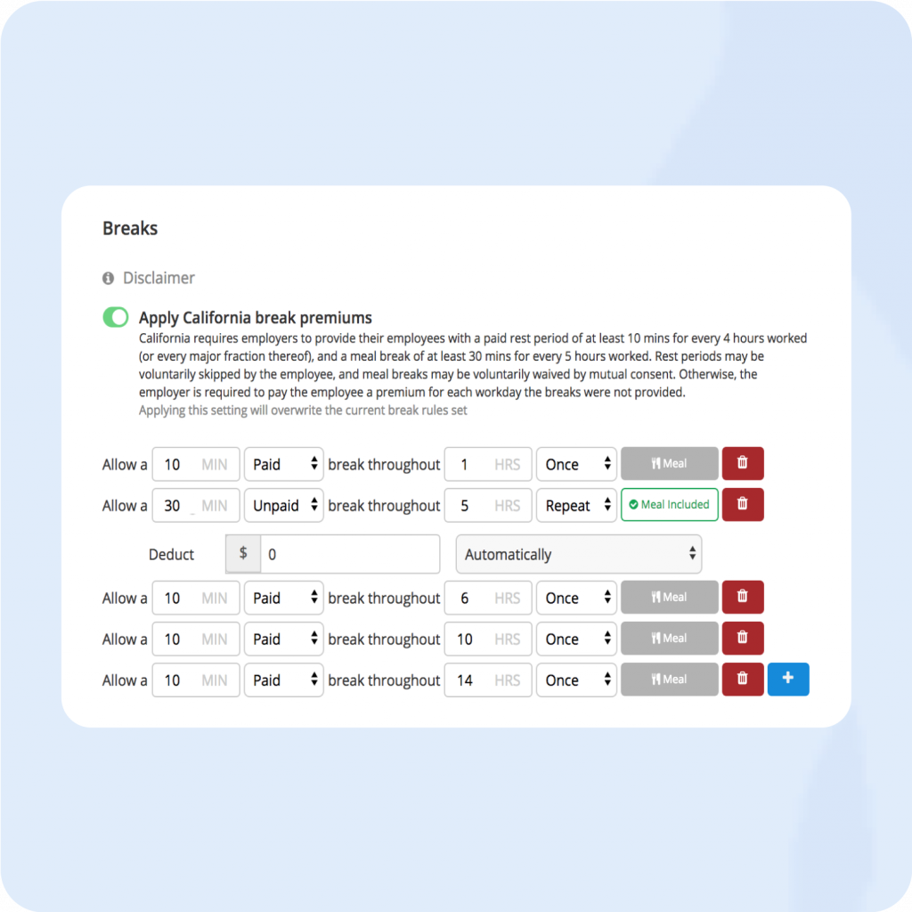 Leverage a dynamic break rules engine that prevents publishing scheduling violations, delivers advanced warnings and automated pay for missed breaks and integrates waivers and missed break attestations.